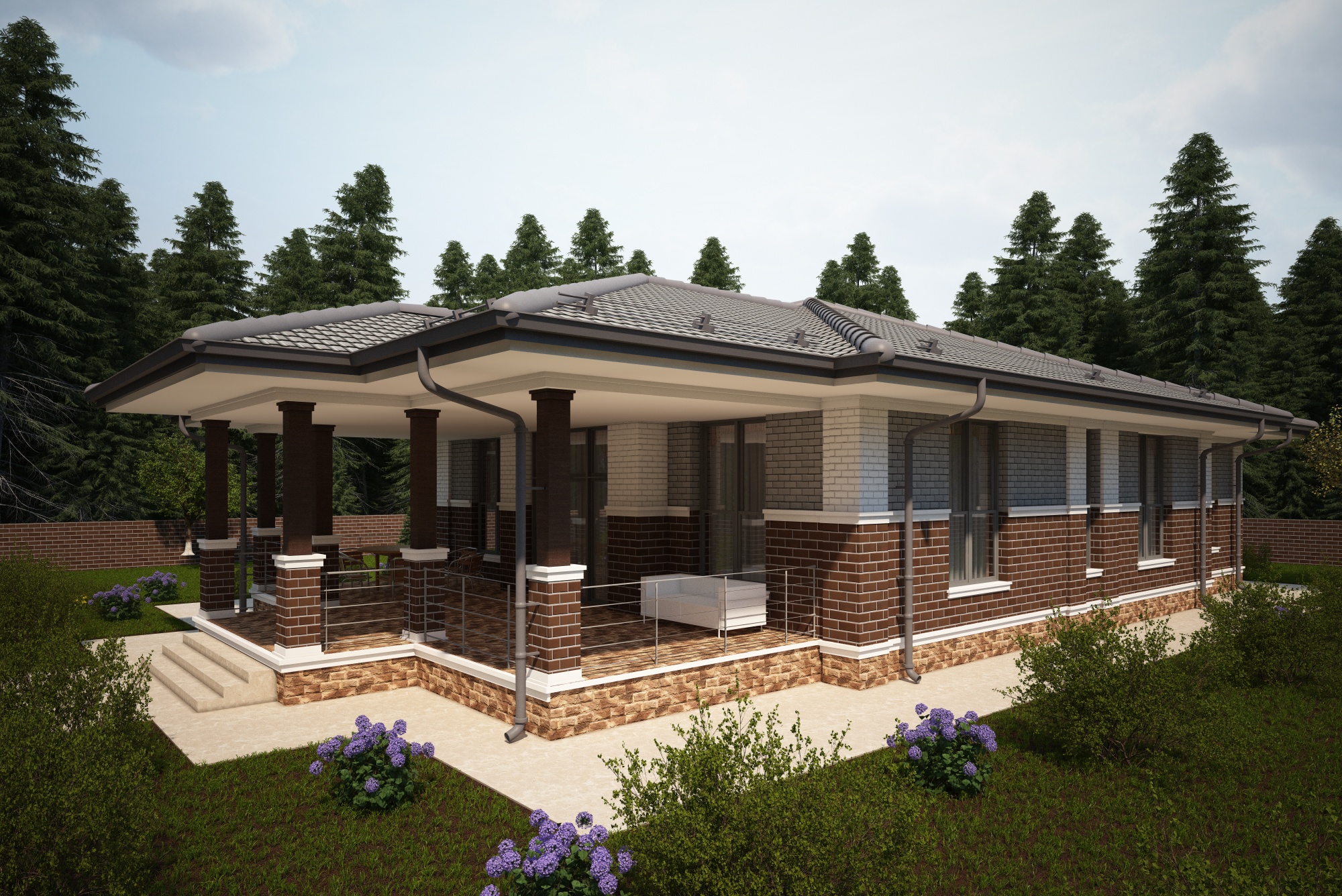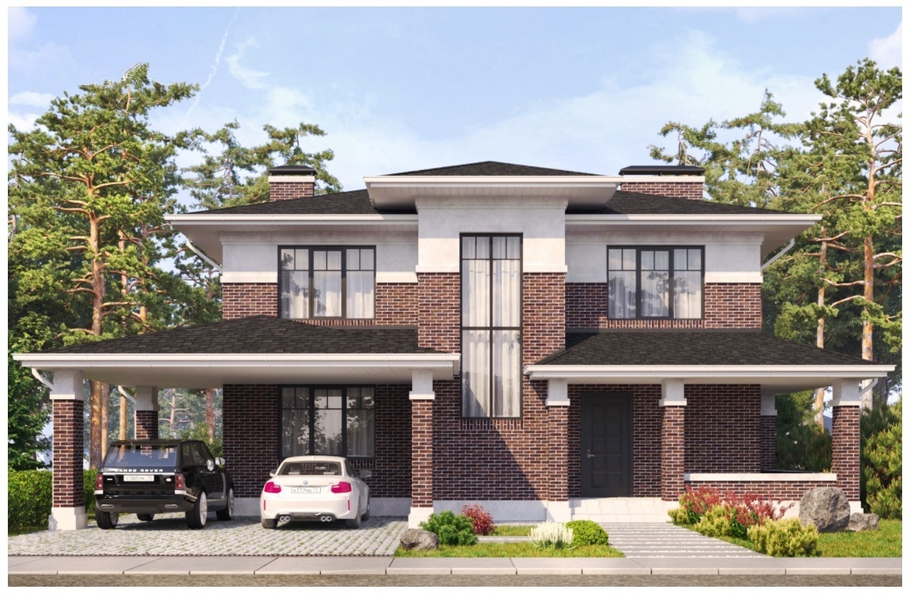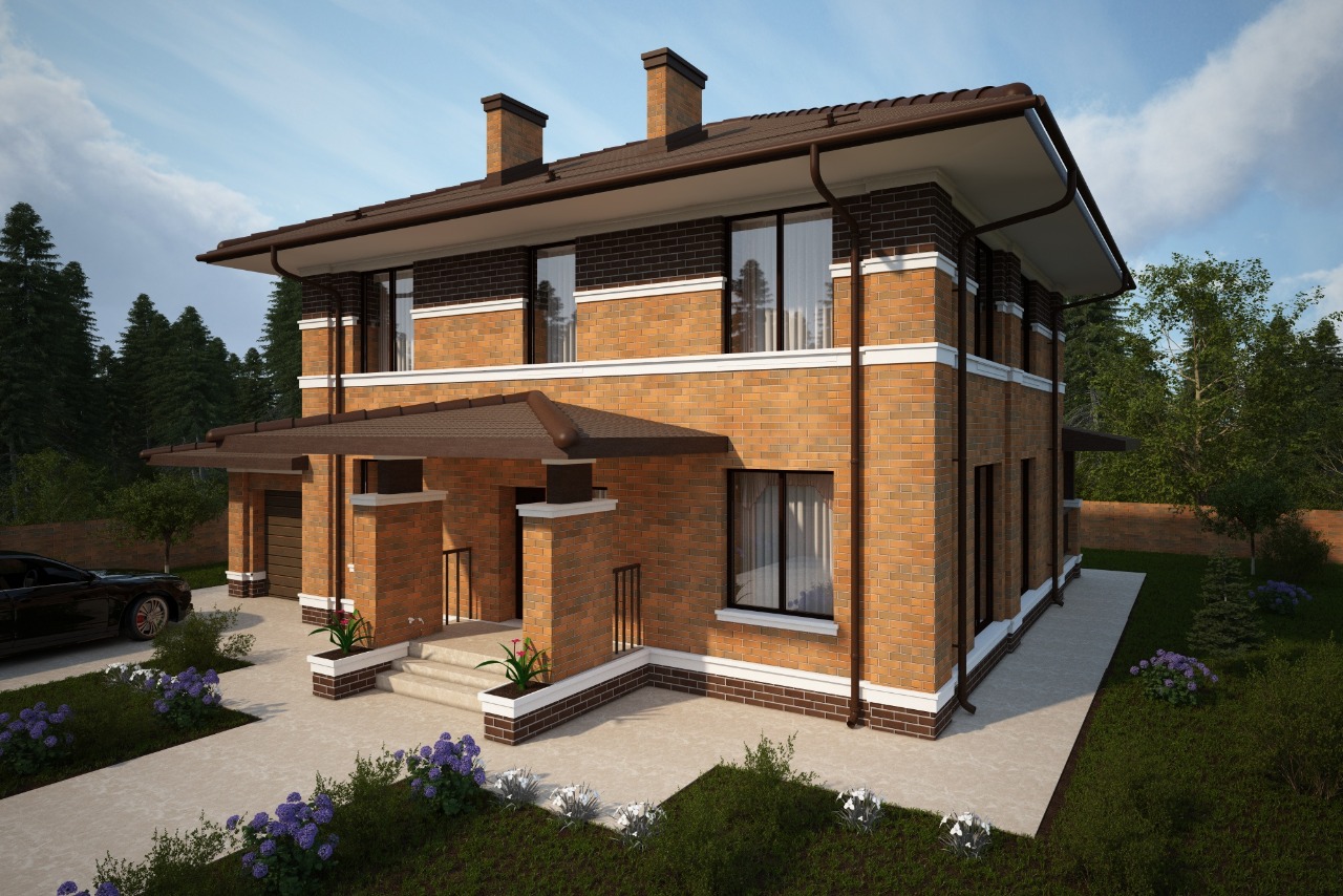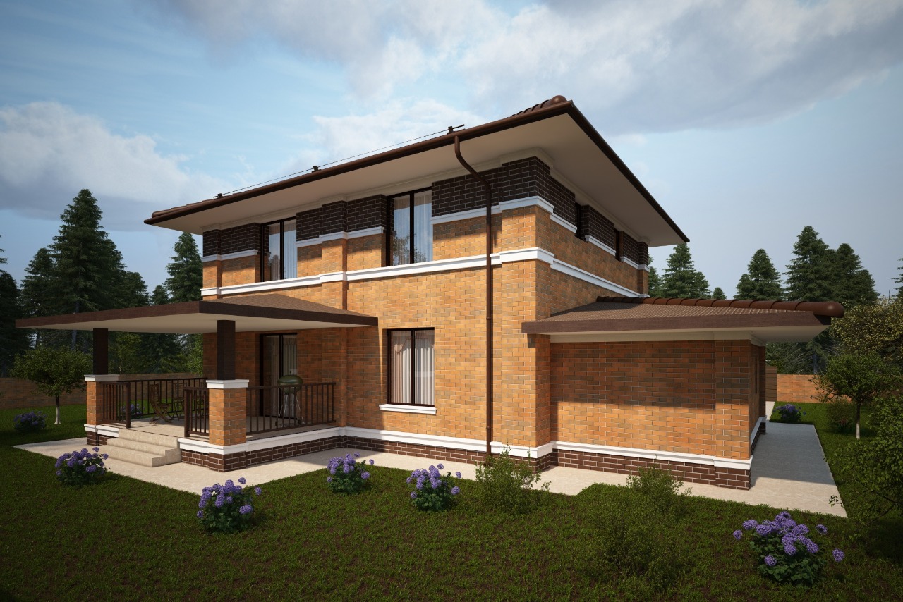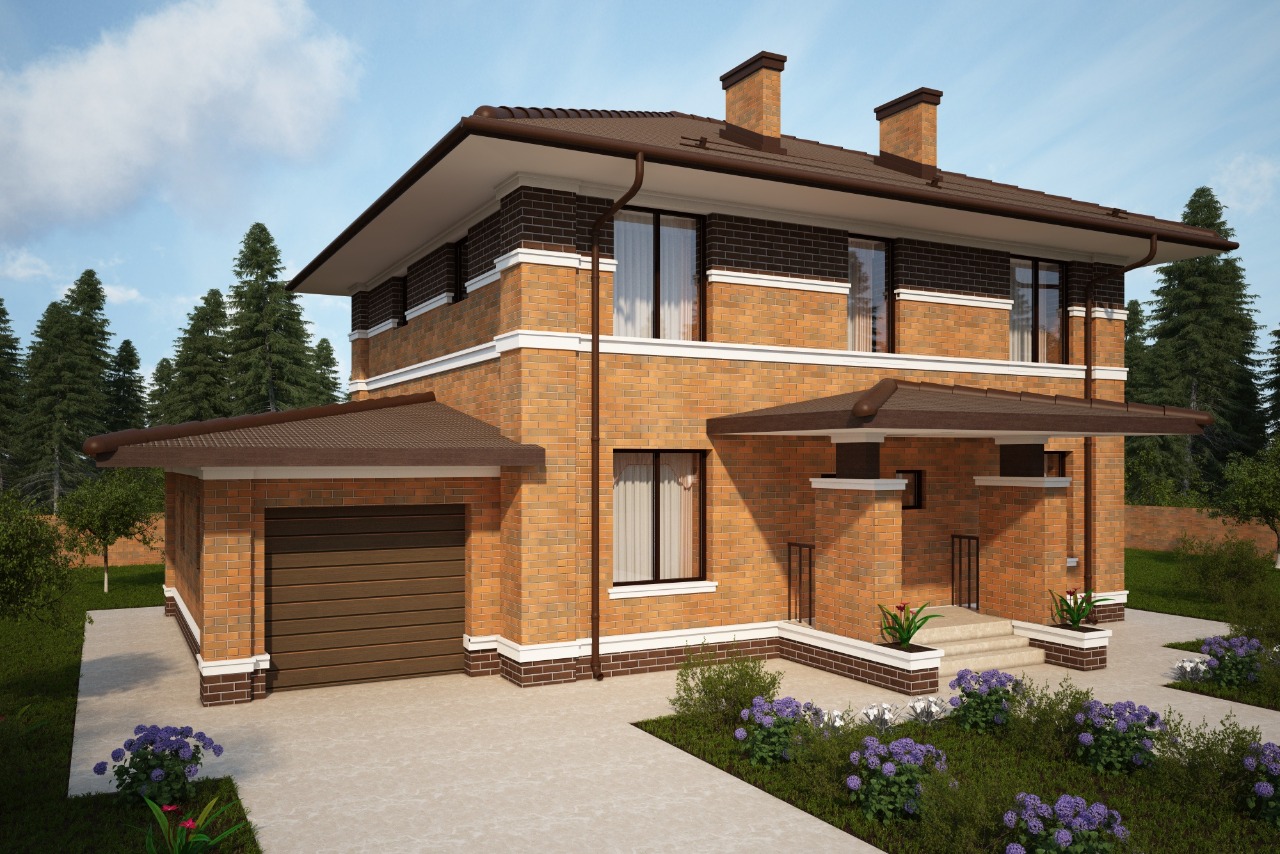 Проект коттеджа с гаражом и открытой террасой для семьи с 2-4 детьми. Фасад дома выполнен в архитектуре Райта из кирпича с молдингами.