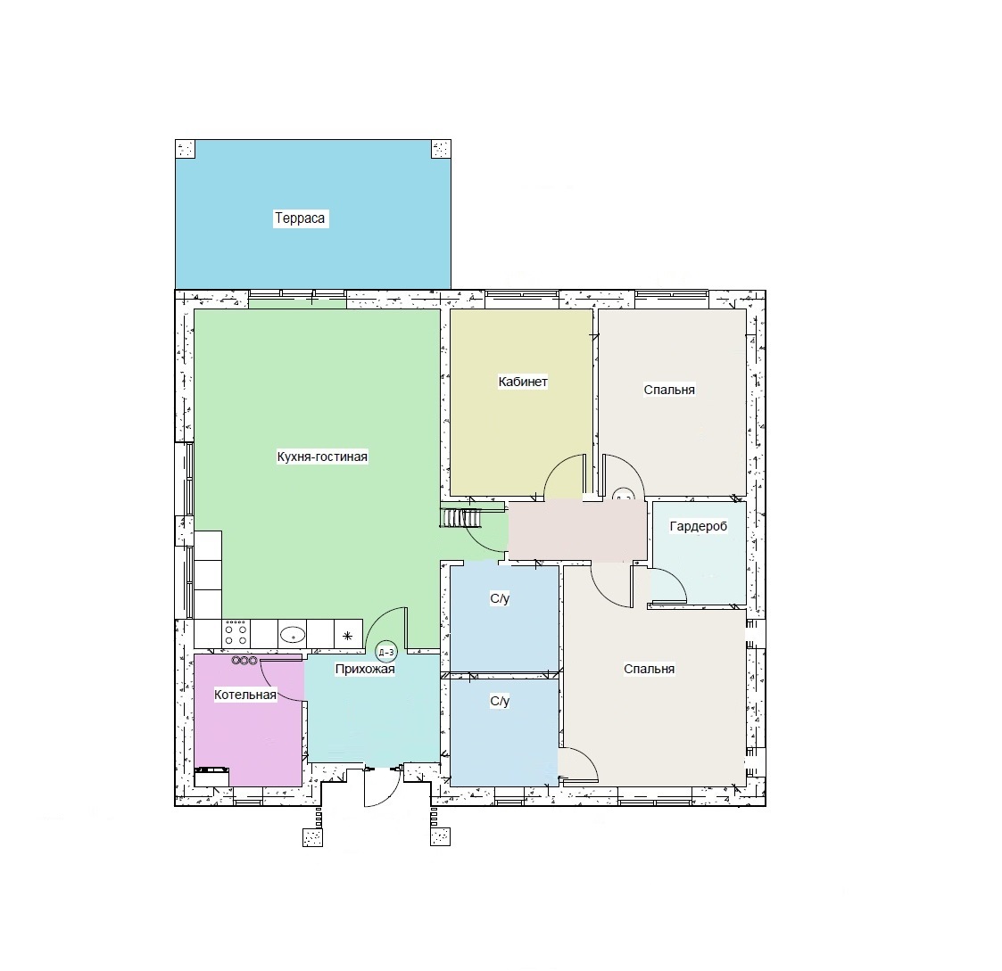 Индивидуальные решения такие: вход в котельную обязательно из кухни. Котельная под газ.