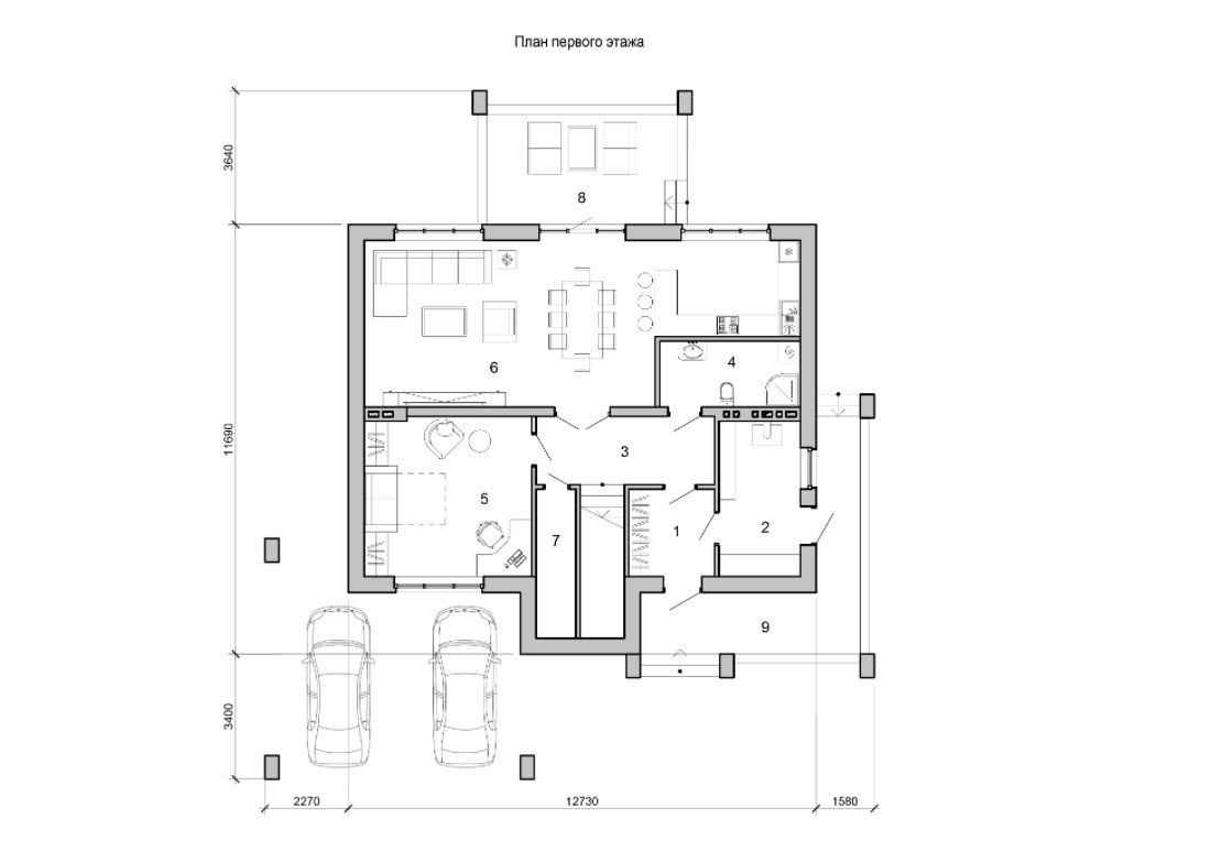 Проект подходит для проживания большой семьи. Примыкающий к дому навес для автомобилей экономит пространство на участке.
